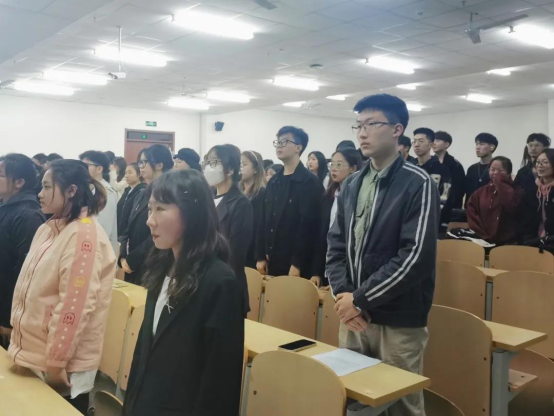 会议的开始,全体同学起立齐唱国歌。唱国歌是一种有意义的爱国主义教育,可以唤起青年对国家的热爱及民族的自豪感,更可以在大国家背景中感受到个体存在的价值和意义。