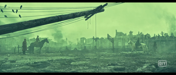 中日两名长官骑马对峙,左上角倾斜的电线杆,上面站着的乌鸦叽叽喳喳,增加肃杀气氛的同时,倾斜的电线杆和日本军官的黑马一起,从构图和配色上给日本军官施加了压力。