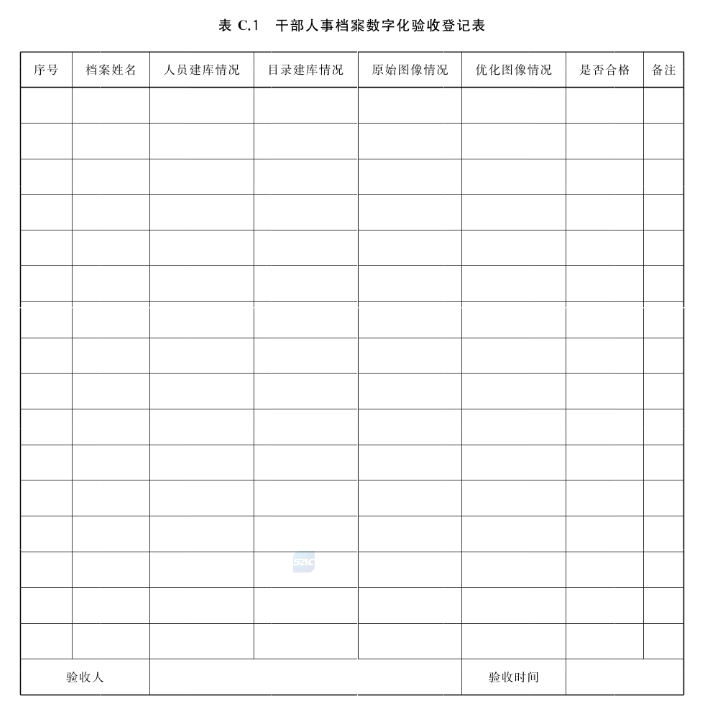 验收登记表干部人事档案数字化质量验收需查验人员建库、目录建库、原始图像、优化图像(可选环节)等工作环节成果,填写《干部人事档案数字化验收登记表》,见表C1。