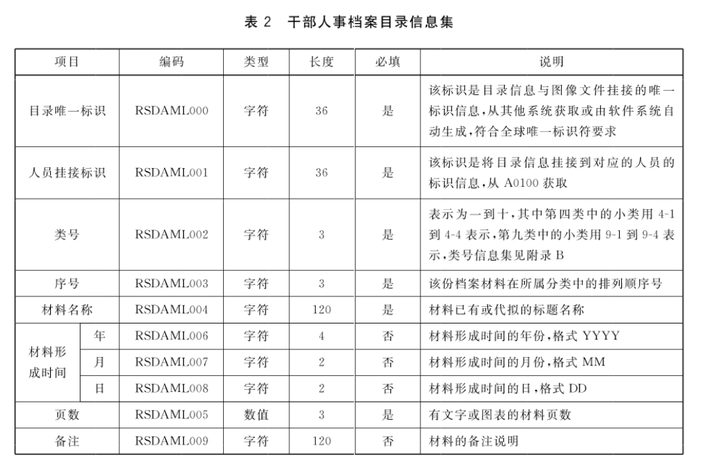 干部人事档案目录信息集的编码为:RSDAML。用于描述档案目录的信息,由10个信息项(见表2)组成。该信息集为多记录信息集,每一记录记述该档案目录涉及档案材料的信息。