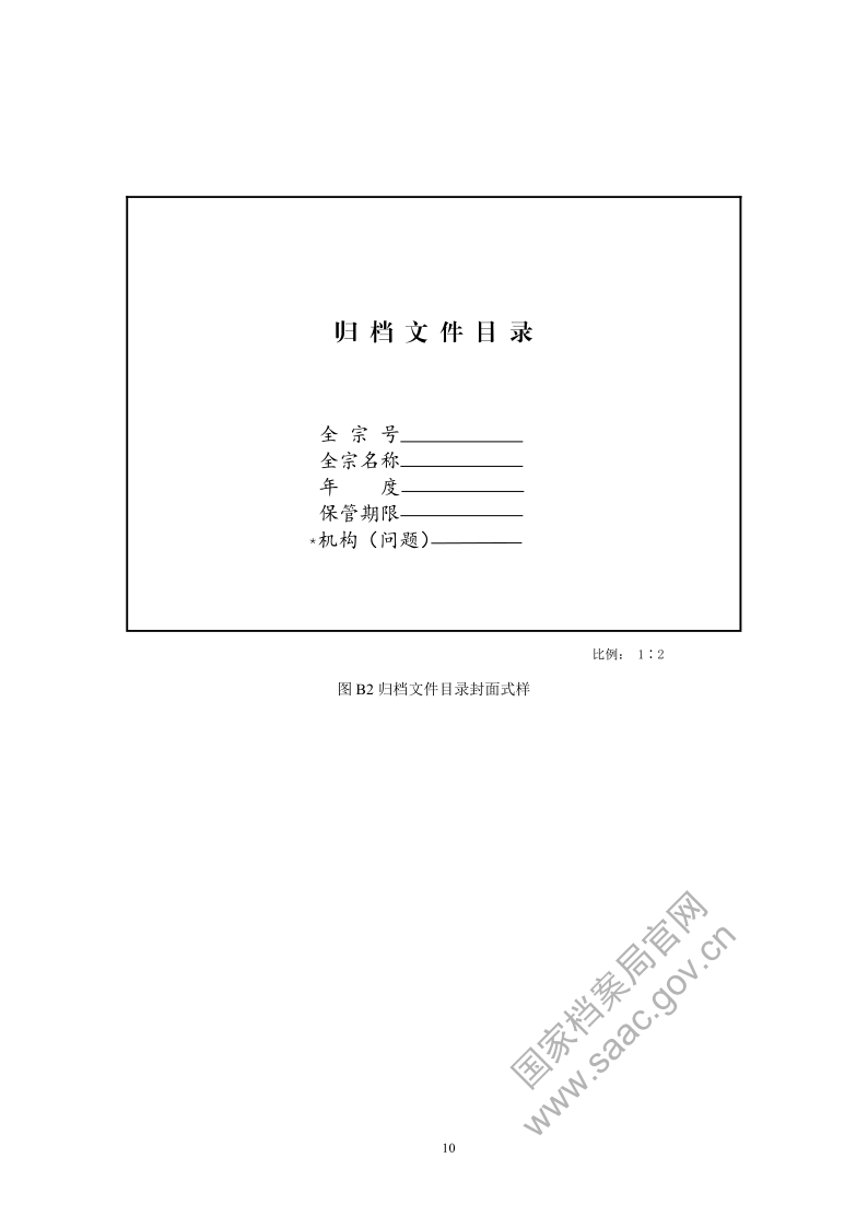 5.5.4 归档文件目录除保存电子版本外,还应打印装订成册。装订成册的归档文件目录,应编制封面(见附录 B 图 B2)。封面设置全宗号、全宗名称、年度、保管期限、机构(问题),其中全宗名称即立档单位名称,填写时应使用全称或规范化简称。归档文件目录可以按年装订成册,也可每年区分保管期限装订成册。
