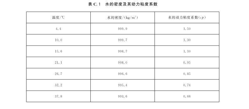 表 C.1给出了常温范围下水的密度与动力粘度系数。