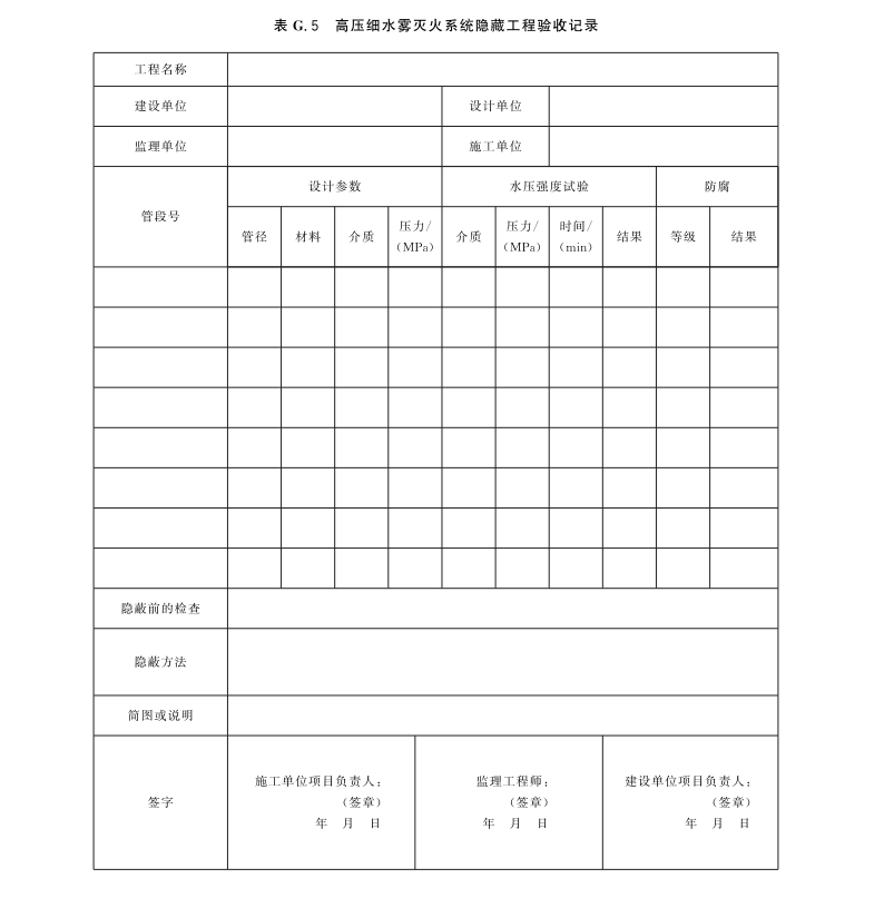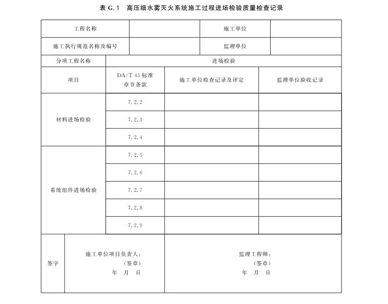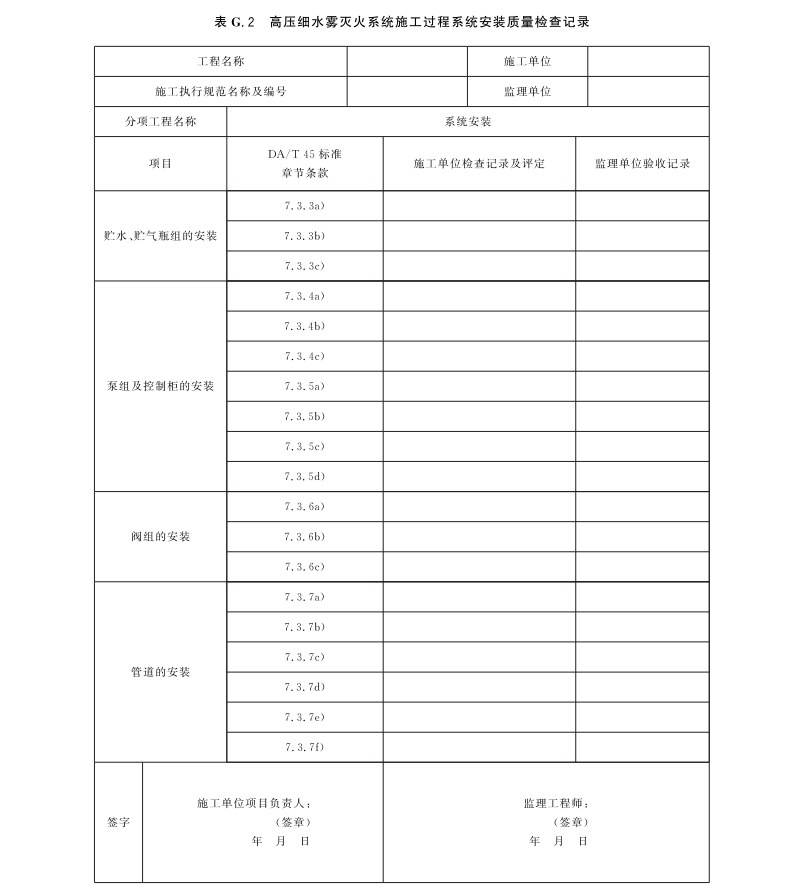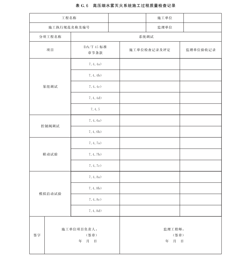 系统施工过程质量检查记录、管网冲洗记录、试压记录及联动试验记录等应由施工单位质量检查员按表G.1~G.6填写,由监理工程师进行检查,并做出检查结论。