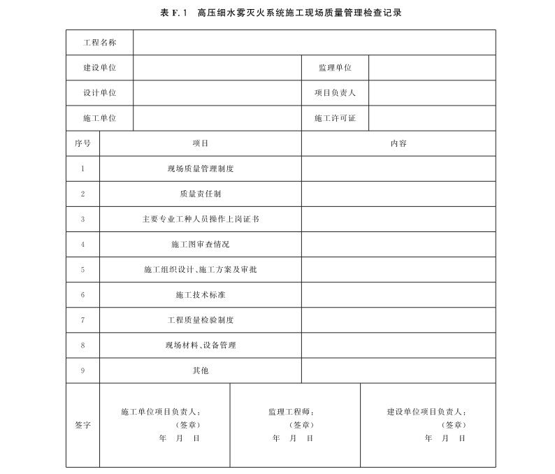 表F.1给出了高压细水雾灭火系统施工现场质量管理检查记录的内容要求。
