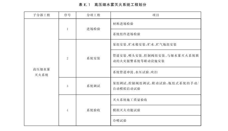 表 E.1给出了高压细水雾灭火系统工程划分标准。