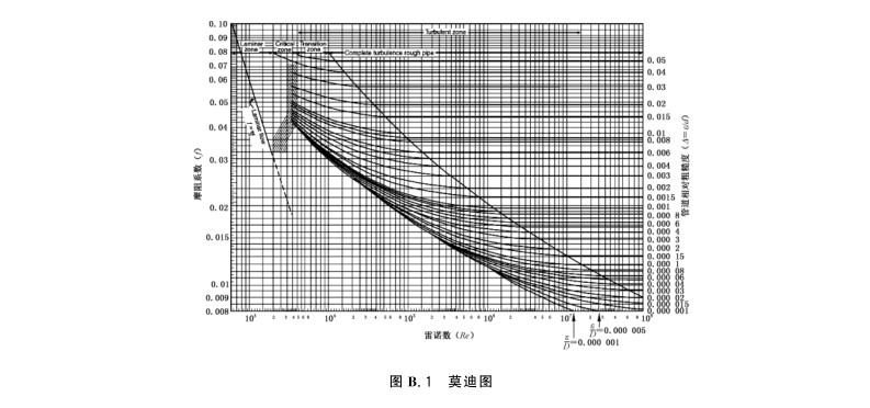 图B.1给出了常温范围下管道内部流动雷诺数、管道内壁相对粗糙度与摩擦阻力系数之间的关系。