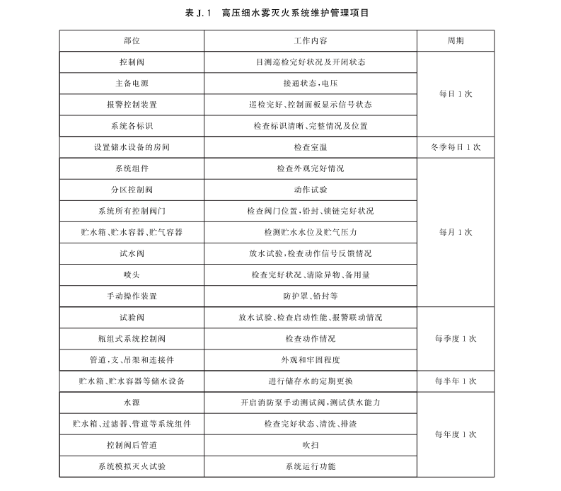 J.1 高压细水雾系统的维护管理工作宜按表J.1的要求进行。