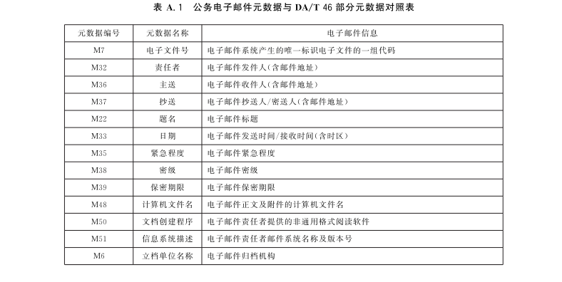 表 A.1 给出了公务电子邮件元数据与 DA/T 46 部分元数据的对照表。