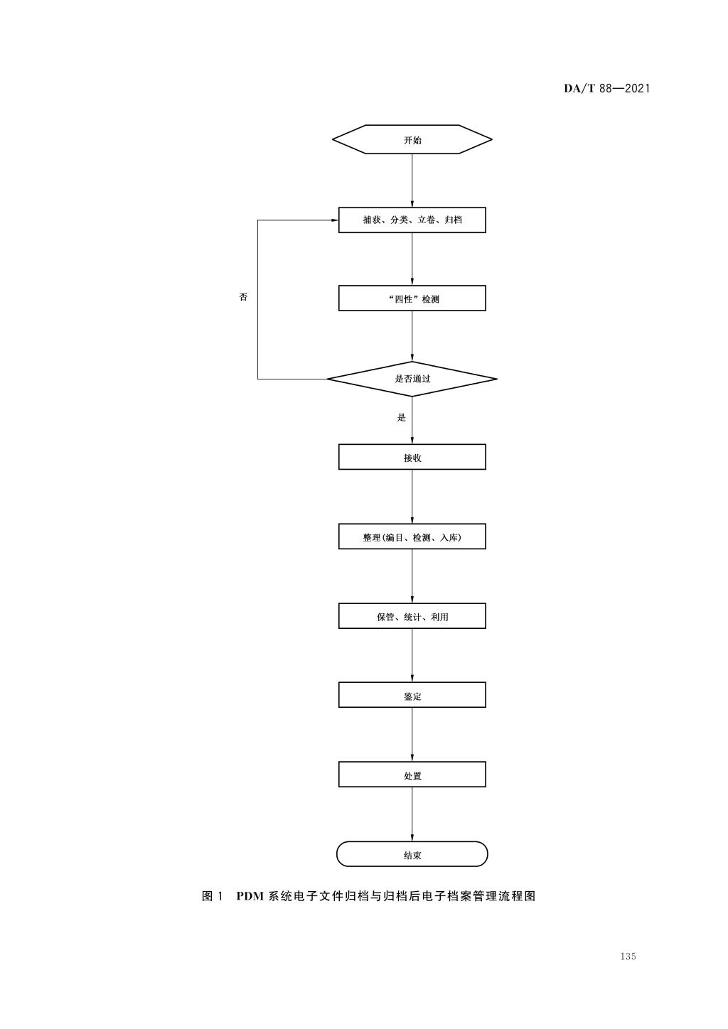 PDM 系统电子文件归档与归档后电子档案管理流程包括电子文件及其元数据捕获、归档、“四性” 检测、接收、整理、保管、统计、利用、鉴定、处置等环节,见图1。