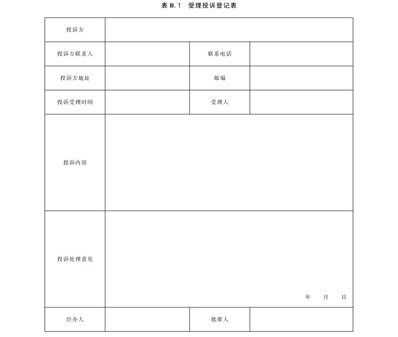 承包方应建立投诉受理机构并填写受理投诉登记表,受理投诉登记表样式见表B.1。