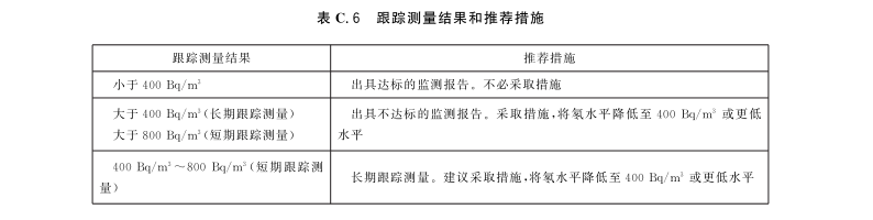 如果筛选测量结果在400Bq/m3以上,则应进行跟踪测量。按照筛选测量结果选择相应措施,见表C.4。