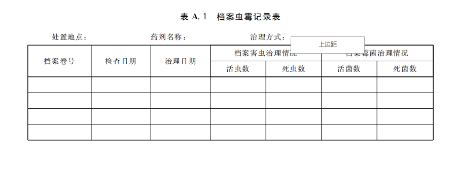 检查时,应详细记录当日库房温湿度、标本数量、采集地点与环境、受害档案的形成年代与材质、档案受害部位、虫霉种类与形态、用过何种防霉驱虫药剂、曾用何种技术治理等,具体参见附录B。