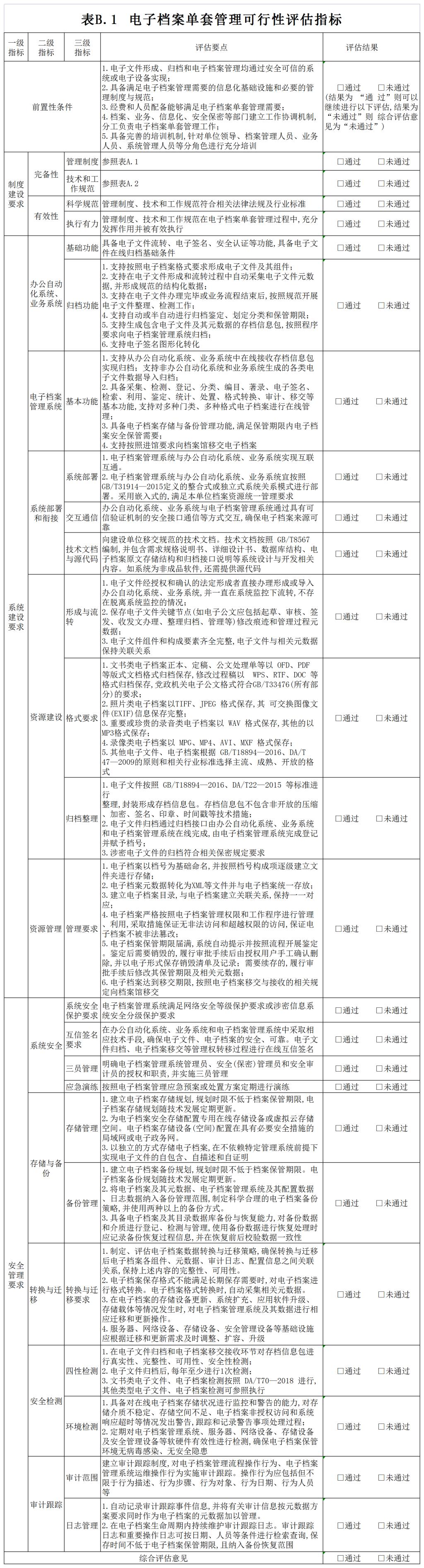 表 B.1 规定了电子档案单套管理可行性评估各级指标及评估要点和评估结果。