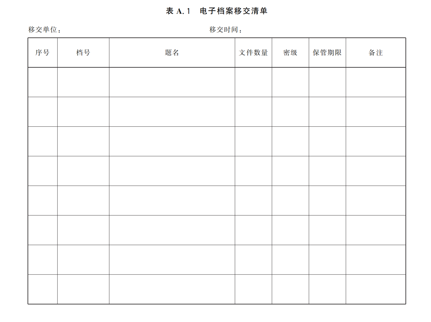 表 A.1 规定了电子档案移交清单的样式。