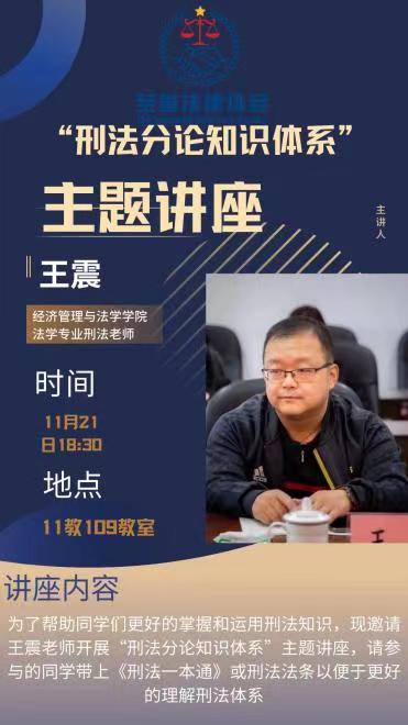 为传递宪法精神,普及法律知识,学院结合专业特点于11月21日晚在11109教室举办了“刑法分论知识体系”专题讲座。本次讲座由我院法学系刑法学课程主讲教师、中国政法大学刑法学博士王震教授作为主讲人。讲座中,王震教授强调了刑法分论在刑法学习中的重要地位,阐述了刑法分论的逻辑体系,分析了刑法分则的重点难点,区分了代表性的易混罪名,提供了学习刑法分论的主要方法。王震教授的讲座形象生动、深入浅出,使同学们对刑法分则的知识架构有了更深刻的理解,对进一步激发学生学习刑法的积极性起到了积极作用。本次活动由经济管理与法学学院至善法律协会承办,协会指导教师葛龙副教授出席。
