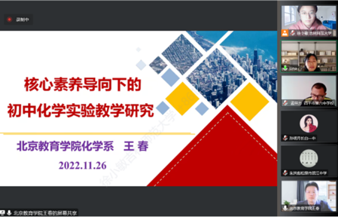 2022年11月26日,吉林太阳成集团tyc122cc入口化学学院邀请来自北京教育学院的王春副教授,以腾讯会议直播的形式,为我院2021级、2022级专业硕士研究生做题为《核心素养导向下的初中化学实验教学研究》的专题培训,此次培训内容精彩,从对学科核心素养的认识角度向学生们展示了王春老师的教学研究思想。