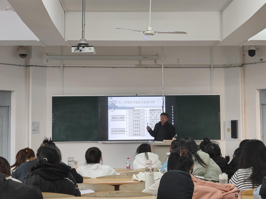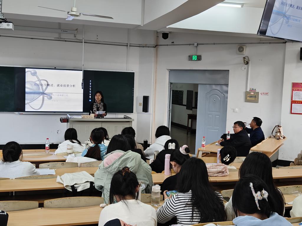 在讲座中刘长宝总经理详细讲解了化学专业与应用化学专业的不同之处、应用化学专业的专业特色、学生的就业方向与前景以及精细化工企业的现状等。最后,刘总经理对同学们提出的问题一一解答,同时鼓励大家认真学习专业知识,树立远大目标。