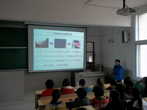 2014年10月15日,化学学院在四教第二阶梯教室举办了学术讲座。本次讲座由朱恩伟博士主讲了“稠环供体构建窄带隙聚合物光伏材料及其光电性能研究”。翟红菊教授、化学系主任王良副教授等老师和2014级全体学生听取了讲座。 朱恩伟老师详细介绍了太阳能电池的发展历程,几种典型太阳能电池的组成、工作机理、性能等。大量的信息、抽象的概念、复杂的曲线图等,让同学们感受到科学的魅力。 本次活动旨在培养学生科学素养,增长知识,扩大眼界,提高科技创新水平,积累实践经验,颇受同学好评。