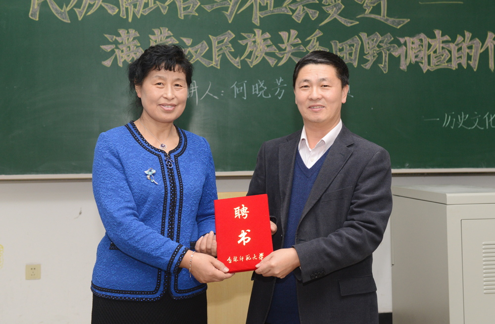 11月24日下午,我校在田家炳教育书院10210教室举行兼职教授聘任仪式,聘任何晓芳研究员为我校兼职教授。校长杨景海出席聘任仪式并为何晓芳颁发了聘书。历史文化学院负责人及部分教师参加了聘任仪式。