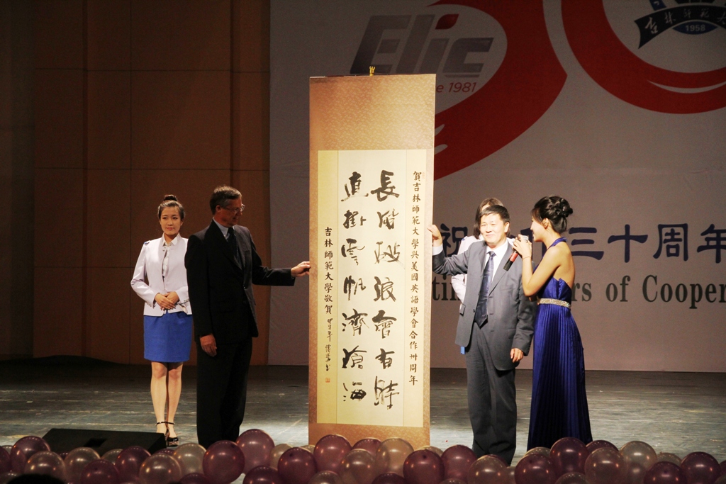 庆祝仪式上,杨景海代表学校向美国英语学会三十年来为吉林太阳成集团tyc122cc入口英语教学质量的提高、英语教育教学改革的促进、中方英语教师业务能力的提高,及全校英语水平的整体提升所做出的突出贡献表示由衷的感谢,并对双方未来的合作充满信心。