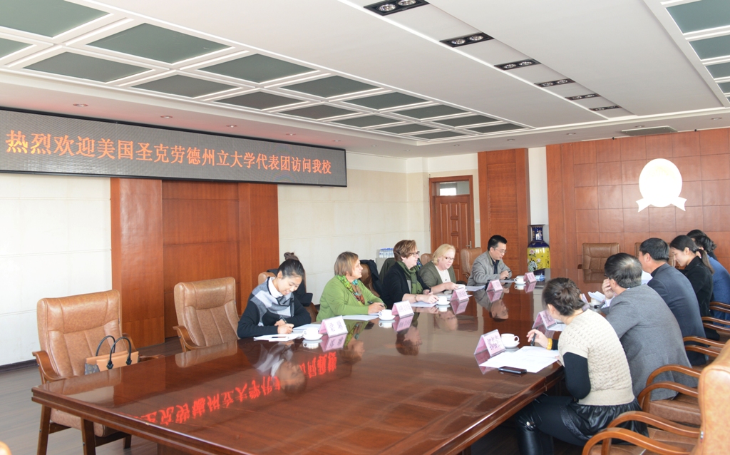 10月28日,美国圣克劳德州立大学孔子学院院长Kathy ?E?Johnson女士、教育学院临床医学系主任Fran Umerski女士及教育学院Cheri Gilman教授一行三人,在吉林省教育厅国际合作与交流处及对外汉语教学培训中心相关负责人的陪同下,对我校进行了友好访问。这是在今年五月两校签署合作协议后圣克劳德州立大学代表团对我校的首次回访,校长杨景海在第一教学楼八楼会议室会见了来访客人。国际交流与合作处、教育科学学院及国际文化交流学院相关负责人出席了会议。