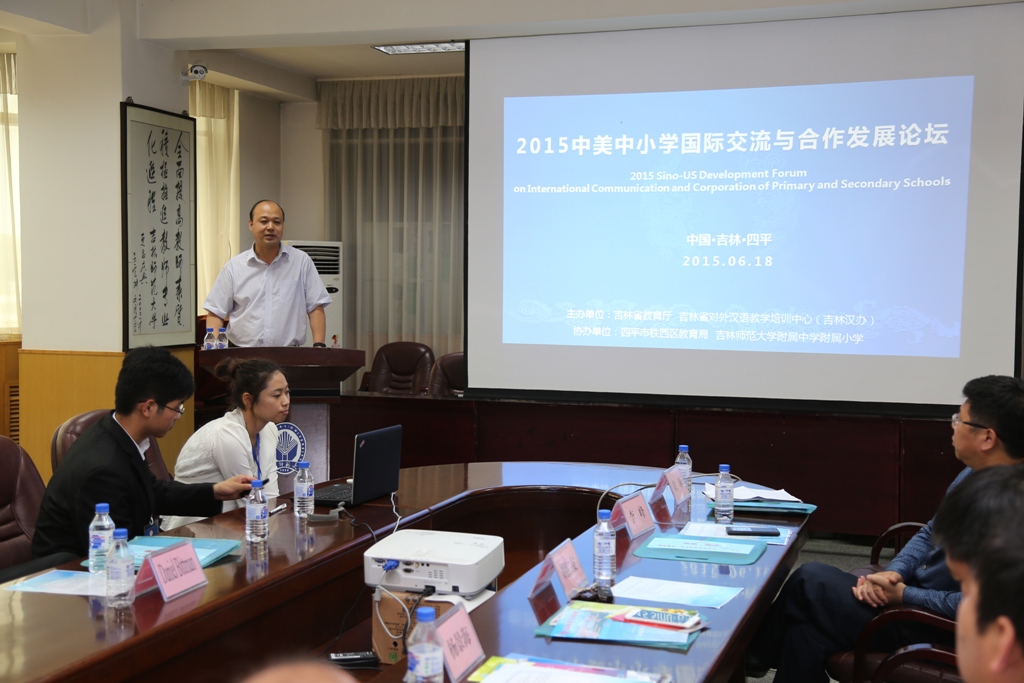 为推动中美两国的教育和文化交流,促进四平市基础教育阶段的国际合作办学,6月18日,由吉林省教育厅主办的“2015中美‘中小学国际交流与合作’发展论坛”在我校附中附小举行。美国明尼苏达州教育官员及中小学校长一行17人、吉林省教育厅国际合作与交流处处长胡仁友、四平市教育局副局长李丽欣、铁西区教育局局长郁建春以及铁西区各中小学校长代表参加了此次论坛。吉林太阳成集团tyc122cc入口校长杨景海作为特邀嘉宾出席会议。