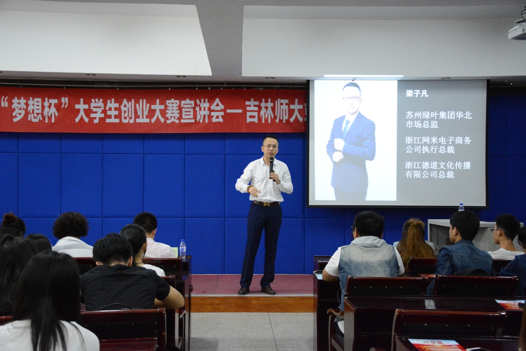 本次宣讲会分为两个环节。第一环节由创业导师梁子凡做宣讲。梁老师结合自己的成长历程及创业经历,鼓励同学们无论创业还是就业都要有信心,要树立长远目标,放眼未来,不虚度光阴。第二环节由吉林省创业促进会副秘书长宁海涛对本届创业大赛的赛程及具体要求做详细介绍。