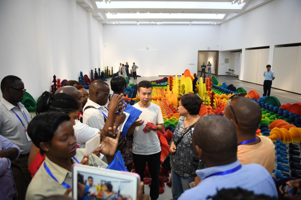 7月20日,由商务部主办、文化部中央文化管理干部学院承办的“2017非洲英语国家文化创意与设计研修班”学员参观了青年艺术家、我校美术学院教师李洪波在北京八一美术馆举办的“花海”个人作品展。研修班学员是来自津巴布韦、肯尼亚、尼日利亚、马拉维、南苏丹等国的信息文化官员和艺术管理者。我校党委副书记刘万民带队赴京代表学校接待并参加相关交流活动, 吉林省人民政府新闻办公室对外交流处处长李校时应邀参加本次活动。