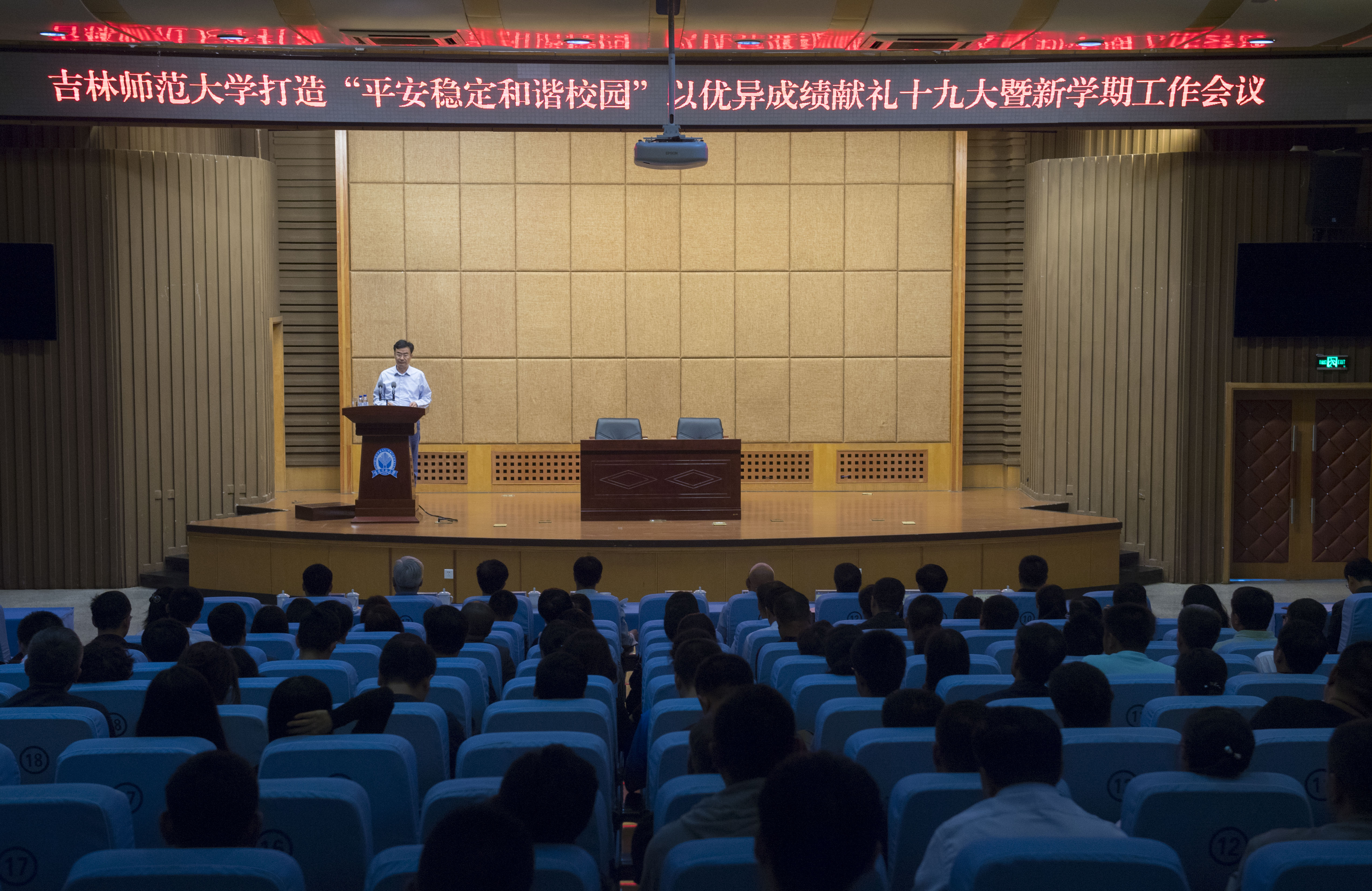 为在党的十九大召开前夕,营造一个平安稳定和谐的校园环境,同时以饱满的工作激情和状态,圆满完成本学期重点工作,用优异成绩向十九大献礼。9月5日,学校在图书馆报告厅召开了打造“平安稳定和谐校园”以优异成绩献礼十九大暨新学期工作会议。校党委书记许才山,校长杨景海,校党委副书记祖国华、刘万民,校纪委书记侯奎岩,副校长李海波、曲殿彬、张作岭、车广波,以及全校副科级以上干部、全体辅导员参加了会议。