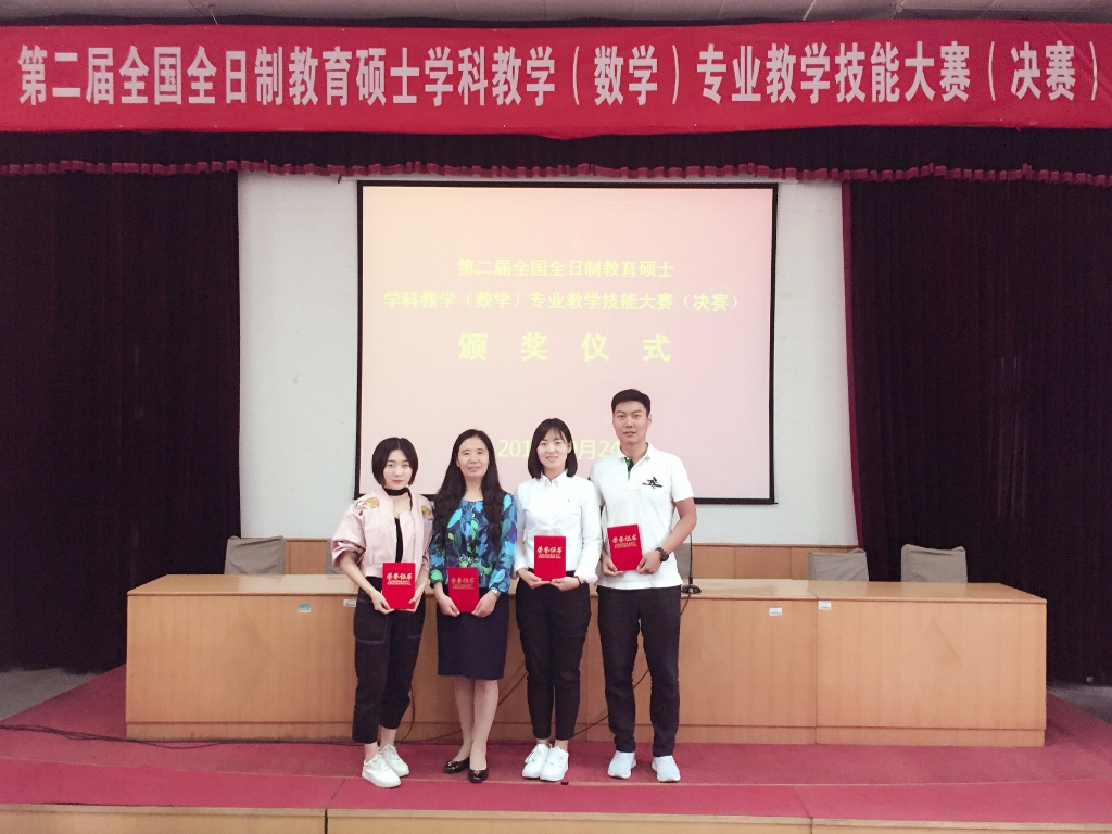 近日,由全国教育专业学位研究生教育指导委员会主办的第二届全国全日制教育硕士学科教学(数学)专业教学技能大赛(决赛)在山东鲁东大学落下帷幕。本次比赛共有80所院校参赛,由说课、讲课和现场提问等几个环节组成。经过激烈角逐,我校数学学院2016级全日制教育硕士研究生王佳莹同学荣获二等奖;袁天雨和张安妮同学分别获得优秀教学设计奖;刘影教授获得优秀指导教师奖。