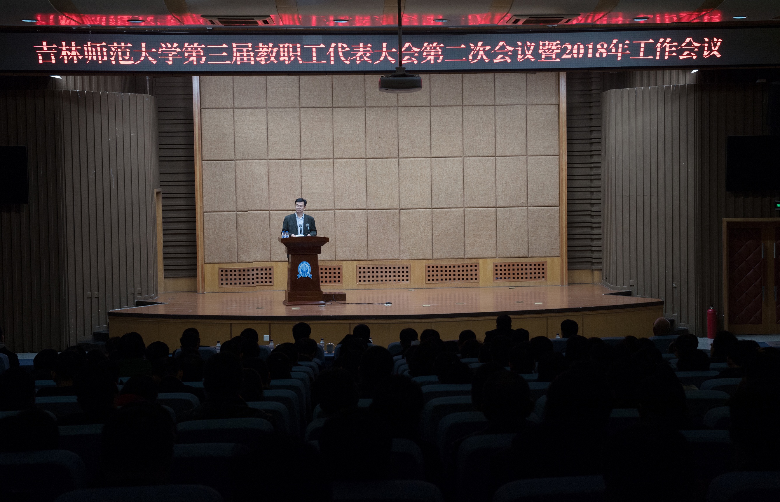 校党委副书记、校长杨景海作2017年工作报告。一年来,学校深入贯彻落实习近平新时代中国特色社会主义思想和党的十九大精神,在全省高校中率先成立“习近平新时代中国特色社会主义思想研究中心”和理论教育宣讲团,创设“新时代传习所”“好好学习”栏目等载体,切实推动十九大精神在全校落地生根、开花结果。学校成功召开第三次党代会,确立了学校未来五年的发展蓝图。学校成功增列为推荐优秀应届本科毕业生免试攻读研究生普通高等学校,学校十大突破初见成效。学校学位点建设取得新突破,被确立为吉林省唯一一所按需推荐博士授权单位。一年来,学校牢牢把握立德树人根本任务,着力强化内涵式发展,有力推动了学校事业全面进步,各项工作有序推进:一是人才培养能力显著提升;二是科研实力持续增强;三是师资队伍建设取得新进展;四是管理机制不断优化;五是社会声誉显著提升;六是民生服务取得实效。此外,学校宣传思想工作、学生工作、统战群团工作等其他各项事业也取得了新成效。