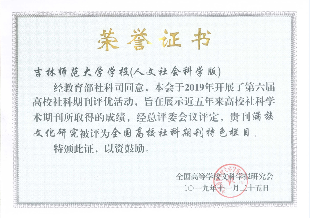 “满族文化研究”栏目荣获“全国高校社科期刊特色栏目”