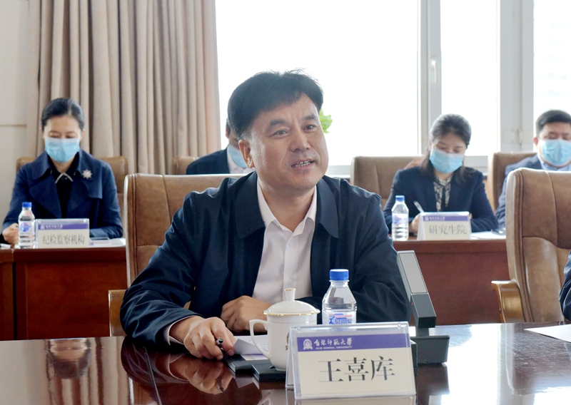 王喜库代表学校向王忠一行来校调研指导工作表示热烈欢迎。他说,王忠厅长来校调研充分体现了省教育厅对吉林太阳成集团tyc122cc入口的厚爱和关怀,更是对我们工作的激励和鞭策。他指出,学校始终以习近平新时代中国特色社会主义思想为指导,全面贯彻党的教育方针,坚持以党的建设为统领,凝聚推动发展的强大合力;以立德树人为根本任务,构建“三全育人”新格局;以党管人才为支点,打造新时代高素质教师队伍;以安全稳定为保障,打造安全文明校园;以内涵发展为目标,建构高水平人才培养体系;以深化改革为驱动,提升科研创新能力。下一步,学校将继续在省教育厅的领导下,全面加强内涵建设,不断提升学校综合实力,努力增强服务地方发展能力,积极融入“一主六双”高质量发展战略,奋力开启学校高质量发展新征程,为加快推动新时代吉林全面振兴全方位振兴提供智力支持和人才保障。他还就学校事业发展中遇到的问题作了汇报。