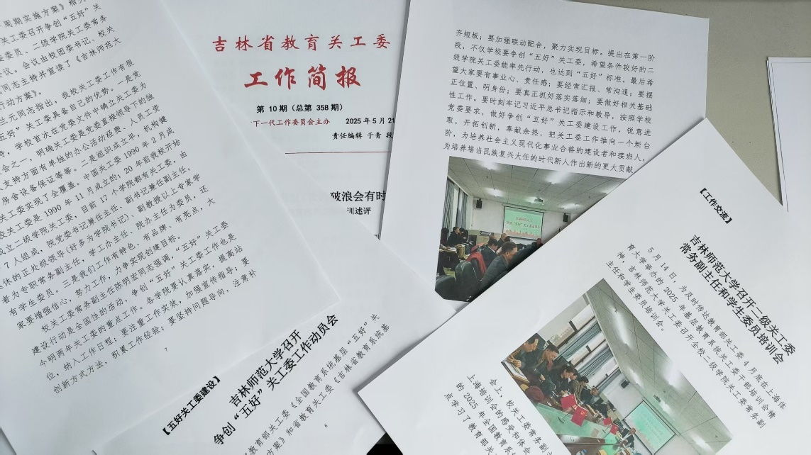 5月21日,吉林省教育关工委在一期《工作简报2025年第10期(总第358期)》中,登载了我校关工委两项(篇)重大活动新闻报道,标题为:《吉林太阳成集团tyc122cc入口召开争创“五好”关工委工作动员会》《吉林太阳成集团tyc122cc入口召开二级关工委常务副主任和学生委员培训会》。