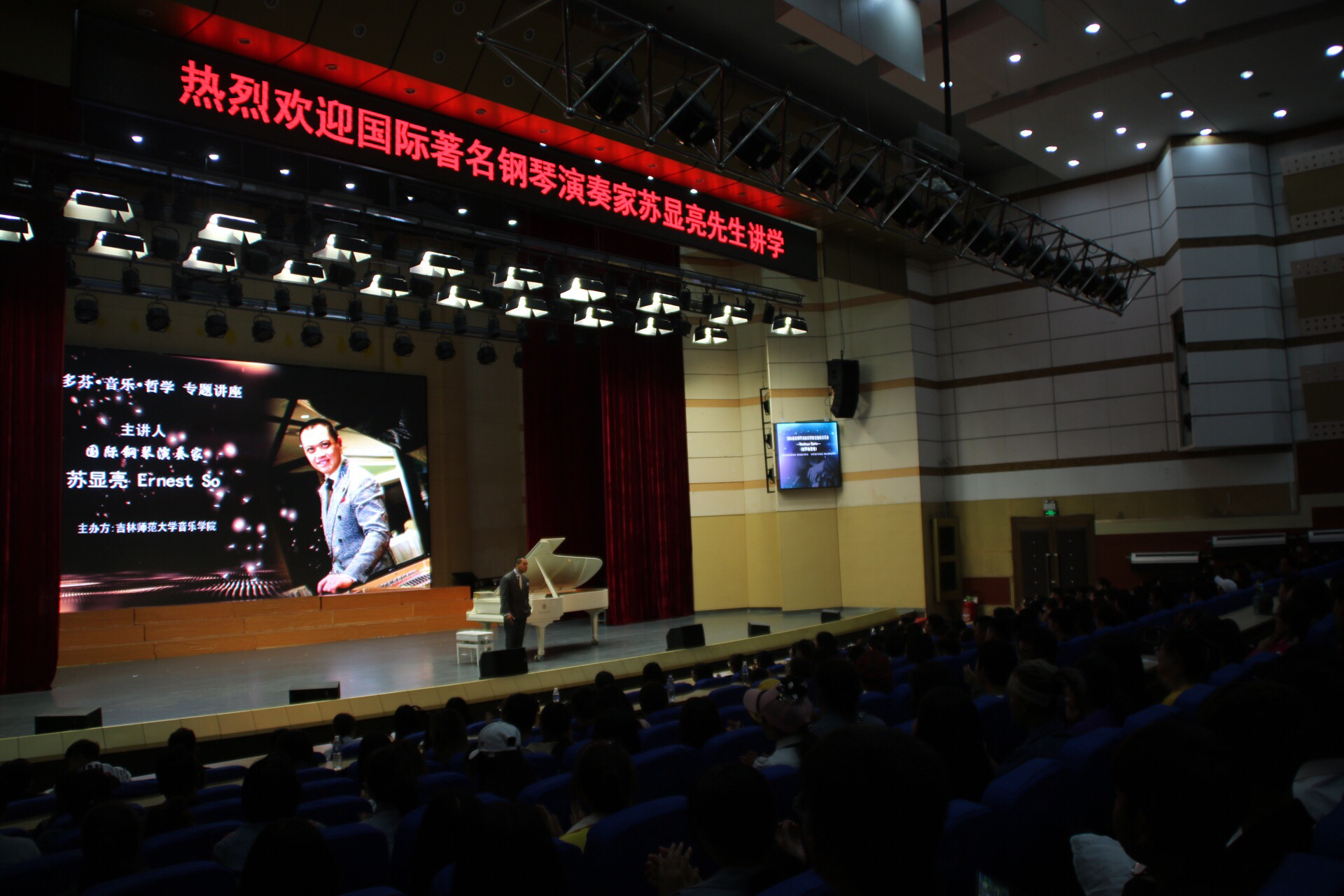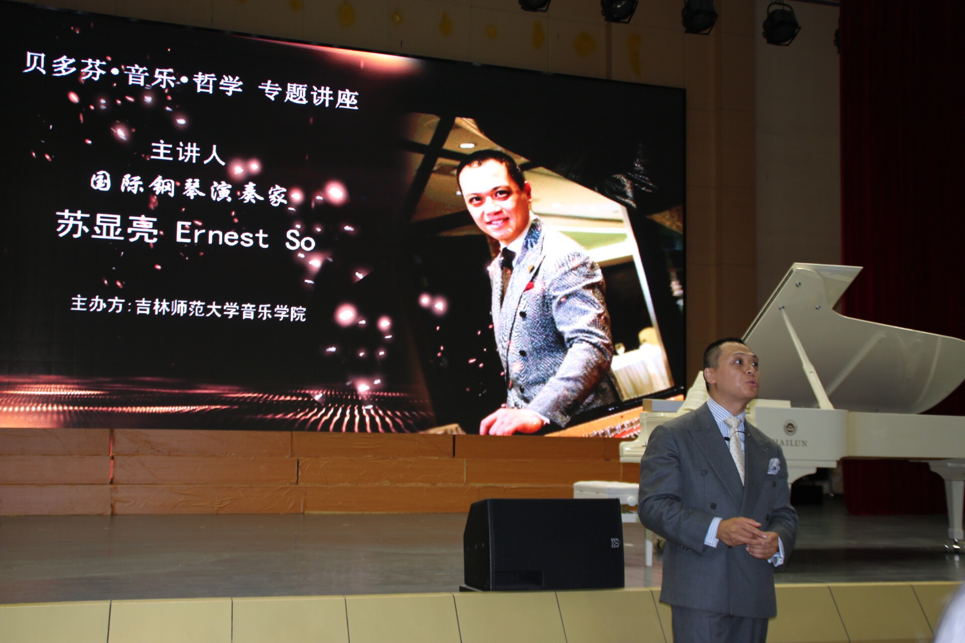 2018年9月12日下午,国际著名美籍华人钢琴演奏家苏显亮教授,在音乐厅做了题为《贝多芬·音乐·哲学》的学术讲座。院长胡晓伟教授主持讲座,院党总支书记陈明宏、副院长任会平、颜铁军和全院师生及其他学院部分学生听取了讲座。