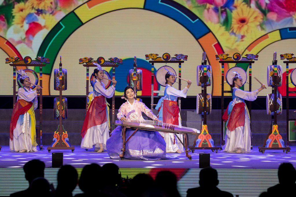 副院长颜铁军博士在合唱《You raise me up》中担任领唱。东北民族音乐研究中心负责人彭丽颖博士领衔表演的伽倻琴与五面鼓重奏《朝乡小曲》,体现了我校在民族文化传承发展上的特色与实力。金镇国副教授携我院2011届校友王拓、2012届校友隋佳佑、陈子旭演唱的歌曲《不忘初心》,成为本次演出的压轴节目。我院退休教师王桂霞编舞并指导了《送吉祥》,体现了我校在满族文化上的地域特色和学科优势。