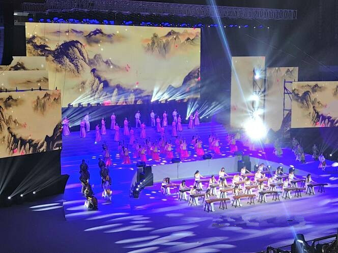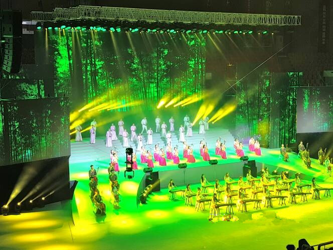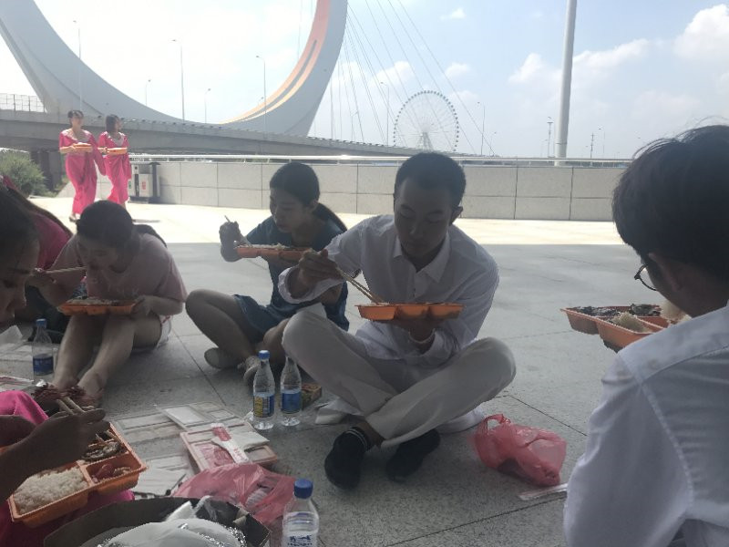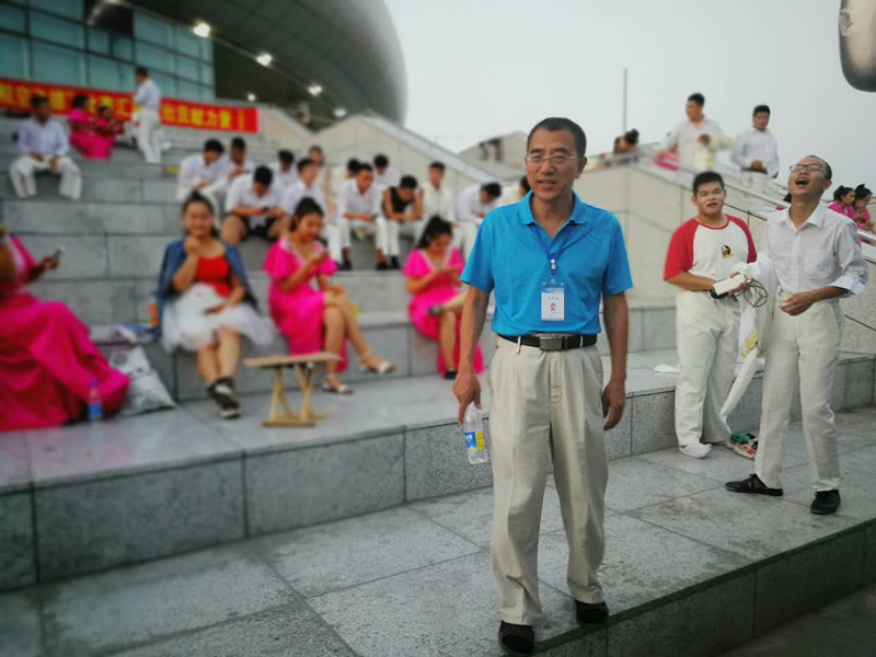 2017年5月末接到任务后,学院领导班子高度重视,召开专题工作会议,院长胡晓伟负责演出全面工作,选用精干教师组成训练指导团,在300多人在校生中选出240人参加,总支书记陈明宏作动员,迅速开展排练工作,指导教师利用每周的《合唱课》、《民族管弦乐合奏课》和业余时间进行系统训练。7月15日暑假开始,合唱团和二胡队、古筝队同学继续留校,进入更紧张的排练期。正值三伏,高温酷热,烈暑难耐,气温简直高到令人窒息的程度,因学校开教代会占用了几天音乐厅,合唱团200名同学就挤在只能容纳130人的教室里学习俄语演唱。教室和音乐厅闷热不堪,二胡队就在音乐楼前小广场顶着似火的骄阳苦练。应组委会和导演组要求,7月23日开始,学生每天到市里的新体育馆进行彩排、联排,学院党政领导班子和指导教师全程参与,做好演出艺术指导、组织安全保障和服务协调工作。由于体育馆刚刚交付使用,馆内设施尚未全部完工,没有候场厅,同学们只能在馆内走廊和室外空地等候彩排。经常演练到凌晨一、两点钟甚至三点半才结束,匆匆返校稍作休息,早晨七、八点钟又要开始新的排练。彩排很晚的那几天,有的躺在地上睡,有靠在椅子上睡,互相靠着睡,等到登上舞台时,大家还是尽全力演唱。师生用餐常常是就地而坐吃着盒饭,休息只能是席地而躺小憩一会。由于长时间超负荷排练,多位同学胃肠不适,出现呕吐、胃痛;有的同学因灯光昏暗踩台摔伤;二十几名同学先后感冒发烧,有的同学甚至晕倒在舞台上,被120救护车送医院治疗,打完吊针稍有缓解就又登上舞台。同学们从不叫苦叫累,女同学主动为男同学化妆,大家互帮互助,团结协作,把训练当作责任使命,把参加演出当作难得机遇和至高荣誉,真是令人感动和赞扬。合唱指挥郭明显老师家住长春,孩子妻子先后生病,他就晚上回去照顾家人,早上又坐高铁赶回现场,一直坚持排练,从不耽误;外聘教师吕艳超、谷常丽为演出尽心尽力,二胡队服装开始没到位,吕老师就从长春借来,谷老师为古筝队购买服装亮片、精心缝制饰物等等。