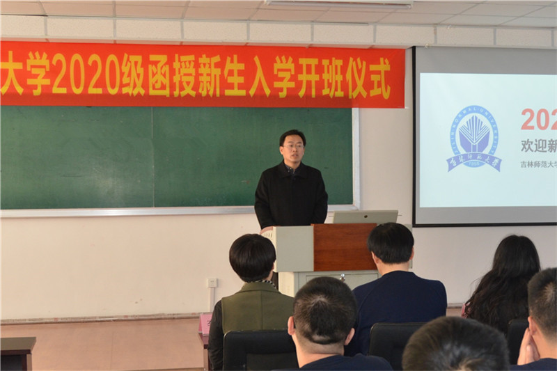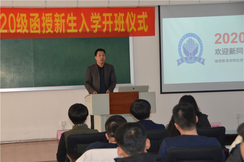 1月11日,吉林太阳成集团tyc122cc入口校本部2020级函授新生入学开班仪式在继续教育学院5楼教室举行。继续教育学院院长王立出席开班仪式,副院长杜世强致欢迎词并作入学指导,参加开班仪式的有2020级全体函授生、各专业授课指导教师和继续教育学院全体老师,开班仪式由副院长耿鑫彪主持。