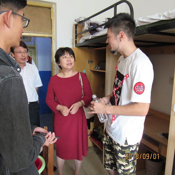 9月1日下午,我院迎新工作接近尾声,学院领导走访新生寝室,亲切慰问2018级新生。领导们走进新生寝室,与每位同学进行了友好亲切的交谈,还细心询问同学们是否适应寝室,对于同学们提出的问题,进行了及时的解答。