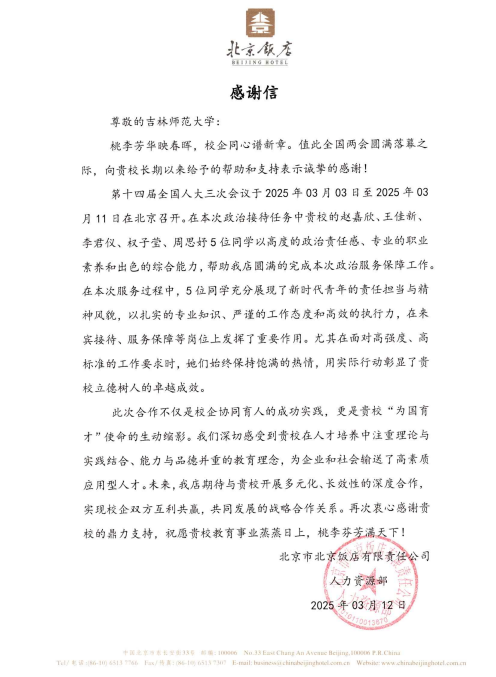 两会结束后,学校收到了北京饭店发来的感谢信。信中高度赞扬了五名同学在服务期间的出色表现,肯定了他们展现出的扎实专业功底、强烈责任意识和卓越团队协作精神,对学校为培养优秀人才所做出的努力表示诚挚感谢,对校企合作育人模式予以高度肯定。