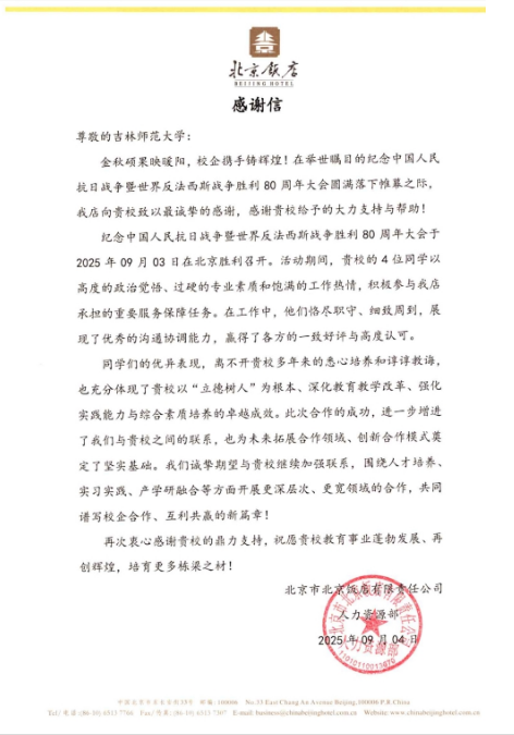 近日,我院收到北京市北京饭店有限责任公司人力资源部发来的感谢信,对我院在纪念中国人民抗日战争暨世界反法西斯战争胜利80周年大会服务保障工作中的支持与帮助致以诚挚谢意。