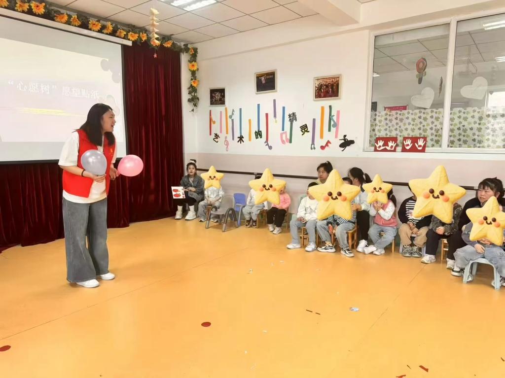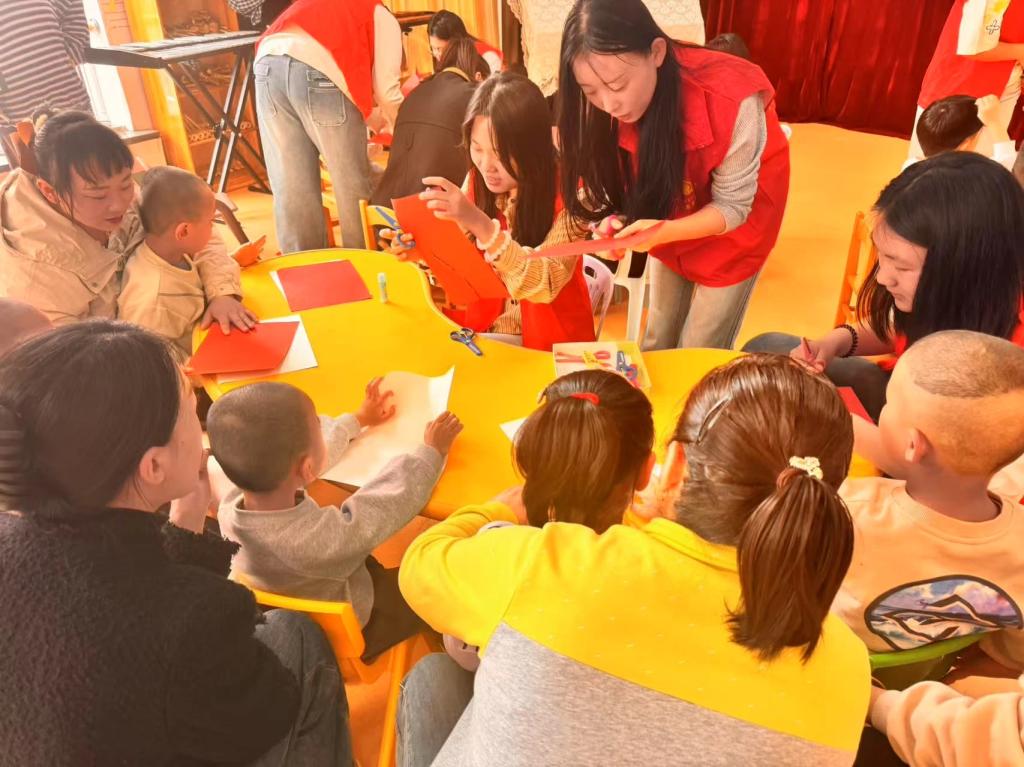 在手工制作环节,孩子们积极参与,与志愿者协作描摹手掌轮廓,将贴有国旗图案的红色手掌拓印在白纸上,象征祖国托举着残疾儿童的成长。扭扭棒在指尖翻飞成蝶,志愿者手把手教孩子们制作蝴蝶结戒指,一枚枚闪耀着童真的戒指从稚嫩的小手中诞生。心愿树上,孩子们在彩色纸片上写下质朴的愿望,在暖阳里晃成了希望的种子。这场艺术与真情的交织为孩子们的生命注入温暖亮色,也见证着志愿者与孩子们的心灵共鸣。