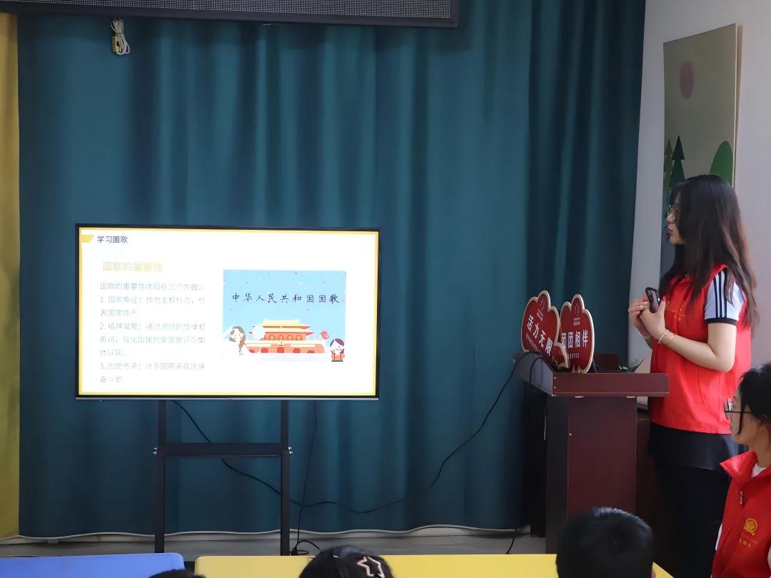 在歌唱国歌环节,宣讲团成员用标准音视频教材实施分句教学。通过学习国歌,帮助学生加深对社会主义核心价值观的理解,增强他们的国家认同感和民族自豪感,让爱国热忱深深镌刻于血脉之中,凝聚为永不褪色的精神底色。