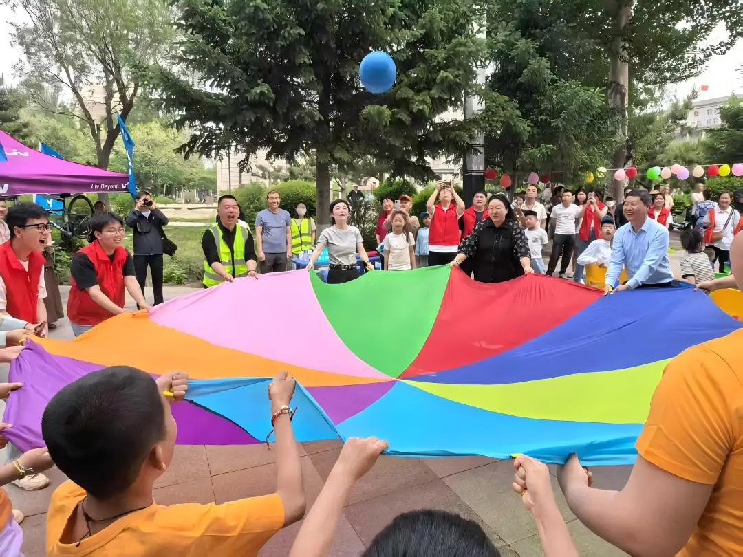 在互动环节,领导们走到小朋友中间,大手牵小手共同托起彩虹球。在众人合力下,彩虹球上下起伏,现场欢声笑语不断,气氛热烈。