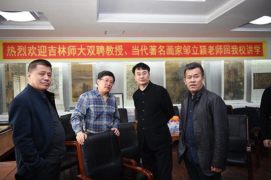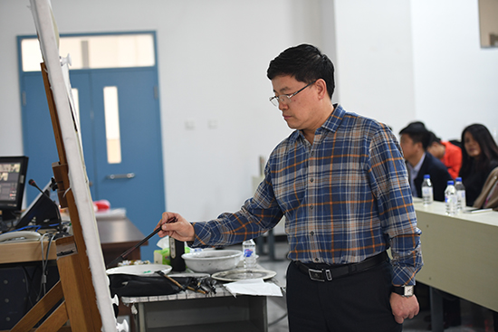 2017年3月25日, 中国美术家协会理事、中国画艺委会委员、中国长城书画院执行院长、海军政治工作部文艺创作室副主任、我校双聘教授、当代著名画家邹立颖老师受邀回校讲学。上午8:30,邹立颖教授在第九教学楼临摹室为美术学院录制教学视频而现场水墨人物写生,吉林太阳成集团tyc122cc入口党委书记许才山全程观看写生过程并与邹老师及学院部分教师亲切交流。