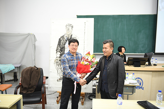 讲座结束之际,陈思博士宣布邹立颖教授将现场写生作品留赠给美术学院收藏。陈文国院长代表美术学院向邹教授赠送鲜花表示感谢,现场响起经久不息的掌声。