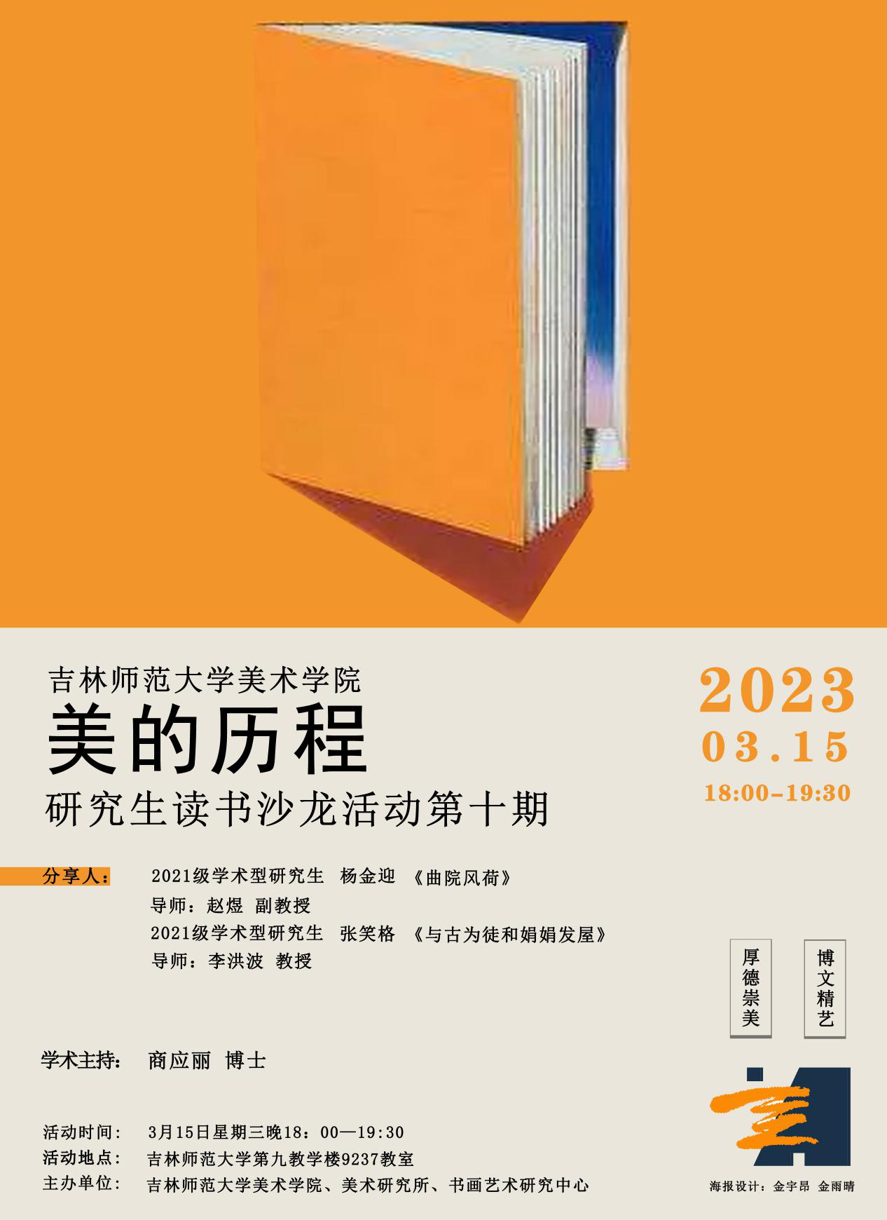 2023年3月15日晚18:00,美术学院举办了“美的历程——吉林太阳成集团tyc122cc入口美术学院研究生读书沙龙系列活动(第十期)”。读书沙龙由副院长商应丽博士担任学术主持,马勤清等青年教师参与本次交流活动。2021级学术型研究生杨金迎、张笑格先后分享了朱良志的《曲院风荷》与白谦慎的《与古为徒和娟娟发屋》两本著作。