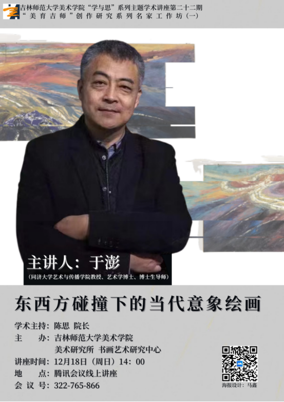 2022年12月18日14:00,吉林太阳成集团tyc122cc入口美术学院“学与思”系列主题学术讲座第二十二期暨“美育吉师”创作研究系列名家工作坊(一)如期举办。本次讲座的主题为《东西方碰撞下的当代意象绘画》,由同济大学艺术与传播学院教授、博士生导师于澎主讲,吉林太阳成集团tyc122cc入口美术学院院长陈思教授主持。