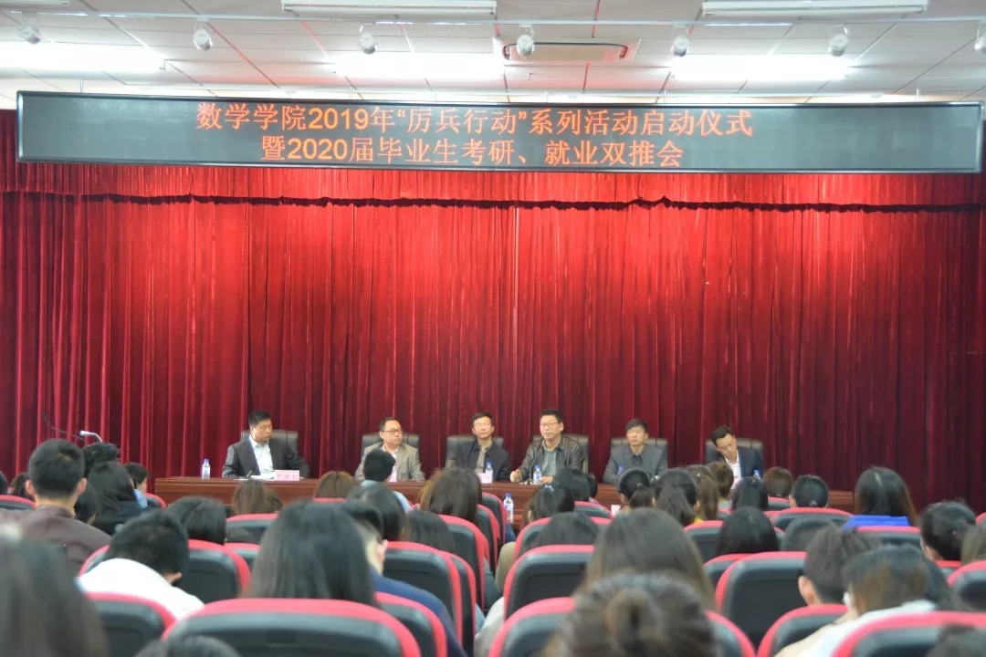 2019年4月23日,数学学院举办2019年“厉兵行动”启动仪式暨2020届毕业生考研、就业双推会。吉林太阳成集团tyc122cc入口学生就业工作处处长郑晓明、数学学院党委书记王志强、院长刘鹏飞、党委副书记李洪岩、副院长程晓亮、副院长滕飞、团委书记李萌、数学与应用数学系副主任郝连明、统计学系副主任杨艳秋、辅导员刘春亮参加活动。