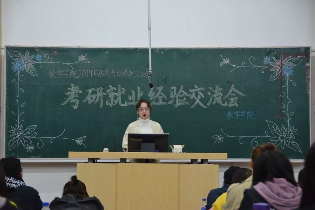 数学学院于2019年4月24日晚六点在6202召开考研就业经验交流会。2015级学生李佳航、王鑫楠、辛宏卓、姜欣、葛思琦、毛冰怡、李琳、赵立妍、宋樱花向同学们介绍了自己考研的经验方法和心路历程。
